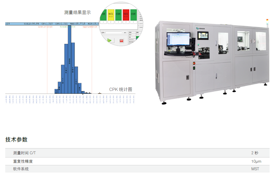 IMS 系列二代是一款高精度的在线快速测量平台,包含测量系统和机械手上下料系统,通过多方向多工位的传感器布局,可以实现小型工件的全尺寸测量。该系统同时集成了重量和磁通量测量。