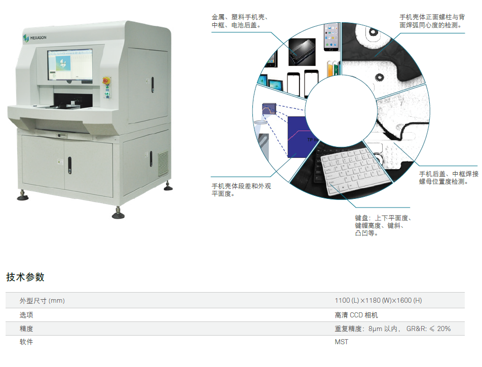 多维尺寸快速检测仪是一款可集多个CCD 镜头或激光于一体的尺寸检测设备,可编程测量多面全尺寸。设备安装了海克斯康集团先进的高速高精度CCD 光学图像系统、数字图像MST 测量软件系统和智能报表转换系统。