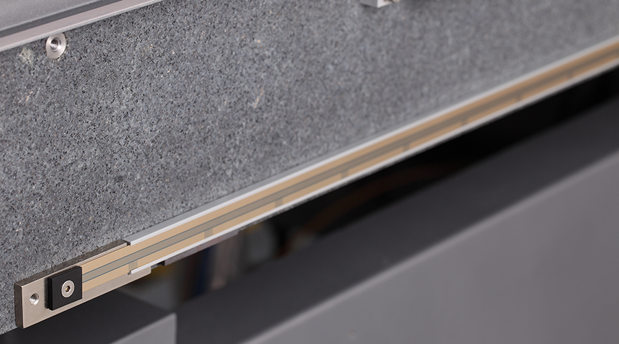 如上图所示,思瑞测量生产的Croma三坐标测量机三轴均采用抗干扰、抗磨损、高品质的HEIDENHAIN金质光栅尺,热膨胀系数获得PTB认证。采用弹性安装方式,线性膨胀+软件补偿,从源头上减少温场变化带来的系统精度和重复性误差,并且延长了光栅尺的使用寿命。